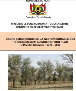 Le Cadre Stratégique d’Investissement sur la Gestion Durable des T erres , élément central de l’approche programmatique des investissements en la matière. En effet, ce cadre permet d’identifier les actions prioritaires sur lesquelles il faut porter les investissements sur la Gestion Durable des Terres (GDT) . Il constitue un tableau de bord permettant de coordonner de manière harmonieuse et cohérente l’allocation des ressources pour le financement et l’amplification des actions de GDT par les différents organismes gouvernementaux et les partenaires au développement. L’objectif ultime est d’améliorer la synergie des interventions, en évitant les duplications des actions et d’utiliser de façon judicieuse les ressources financières. Cette nouvelle approche vient ainsi compléter les efforts entrepris par le Gouvernement de la 7ème République qui a adopté en avril 2012 l’Initiative «3N» pour mettre en œuvre des actions hardies et pour inverser les tendances de la dégradation des terres et l’insécurité alimentaire. Dans son contenu, la politique de « I3N » prévoit des interventions multiformes et rationnellement planifiées ,tant sur le plan opérationnel, que politique, juridique et institutionnel, afin d’assurer la durabilité des bases productives agro -sylvo -pastorales, la mobilisation et la responsabilisation des acteurs. Planifiée au titre de la période 2012 – 2015 , l’objectif global de l’i3N est de « Mettre les populations Nigériennes à l’abri de la famine et leur garantir les conditions d’une pleine participation à la production nationale et à l’amélioration de leurs revenus »