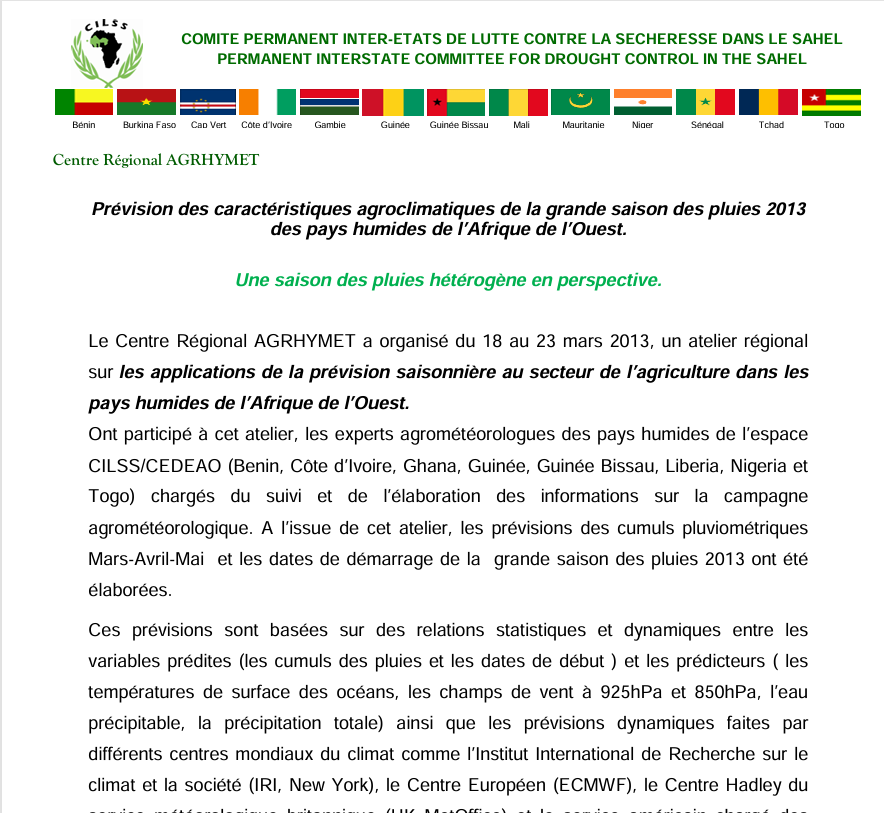 | Prévision des caractéristiques agroclimatiques de la grande saison des pluies 2013 des pays humides de l’Afrique de l’Ouest. | Foresterie, Mécanismes de Développement Propre, Produits Forestiers Non Ligneux, Séquestration de carbone, Systèmes d’Information Géographique | AfricaGIS | |